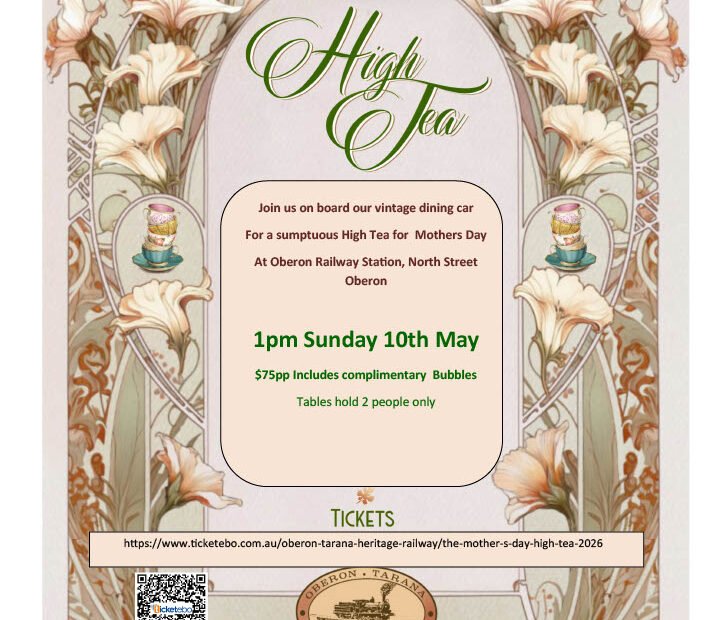 Mothers Day High Tea Join us on board our vintage dining carfor a sumptuous High Tea for Mothers Day. Location:Oberon Railway StationNorth Street, Oberon Date… Read More »Mothers Day High Tea